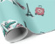 Um presente verde com elementos relacionados com o viagem: um avião, uma bagagem, uma câmara fotográfica e a torre Eifel.