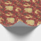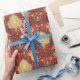 Premium wrapping paper with an ornate repeating pattern of golden angels, nativity scenes, bells, holly, ribbons, and snowflakes on a rich red background—perfect for traditional religious holiday gifts.