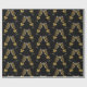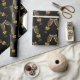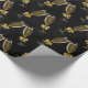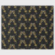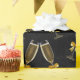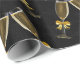 Papel de enrolamento com padrão repetitivo - um par de flautas de champanhe se agarrando. Uma fita de ouro amarrada ao redor do caule. Fundo de damasco preto.