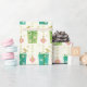 Prados de caixas de presente de estilo vintage, com pássaros pequenos, flocos de neve, ornamentos e estrelas cintilantes, em verde, dourado, rosa, marfim e chalé, num fundo de marfim