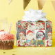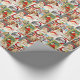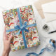 Sempre no estilo, Papai Noel embrulhando papel com muitas imagens diferentes do velho elfo alegre. Papel de lenços e outro decorador doméstico.