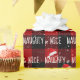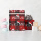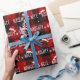 Texto branco NAUGHTY ou NICE com flocos de neve e bonés de Papai Noel em fundo de xadrez de búfalo vermelho e preto.
