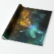 Voo de libélula brilhante, verde, desenhada artisticamente, com asas verdes e amarelas transparentes sobre fundo noturno brilhante com plantas pântanas e vagalumes. Dragonfly brilhante.
