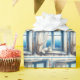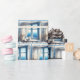 Um gato branco sereno salta em uma janela, banhado à luz do sol através de uma suave cortina de rendas, olhando para um oceano tranquilo que se estende sob um céu azul claro