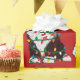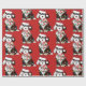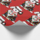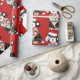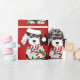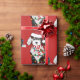 Bela Cartoon Black & White Sheepadoodle Puppy vestindo chapéu de Santa, cachecol vermelho e branco listrado, envolto em luzes de natal. Papel de embrulho vermelho de ovelha adorável!