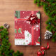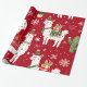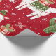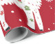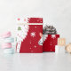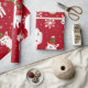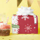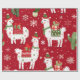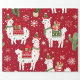 Um padrão festivo com lhamas alegres adormecidas com presentes coloridos e decorações de férias. Os filhotes são colocados sobre um fundo vermelho vibrante, intercalados com flocos de neve e plantas de cacto. Cada Lama esportes uma expressão divertida.