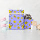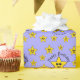 Um padrão de estrelas amarelas sorridentes sobre um fundo roxo. Uma estrela maior tem um texto curvo que diz "Parabéns" e tem um nome. O nome e a saudação podem ser alterados.