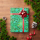 Papel embrulhado em uma safra do padrão William Morris de hiacintos, tulipas e folhas, em tons de esmeralda e jade verde, acentuados com aqua e branco, sobre fundo verde florestal profundo