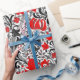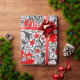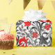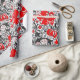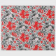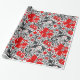 Papel embrulhado numa impressão floral de lírios estilizados e irlandeses, de coloração digital, em tons de cinza/cinza e de folhas pretas, com flores vermelhas profundas, sobre fundo branco