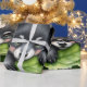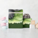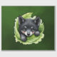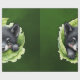 Wolf cub in the green: A view full of magic and warmth. A charming digital illustration features a wolf pup nestled within vibrant green lettuce leaves. The pup has black and grey fur, with a white muzzle and paws, and large, expressive green eyes. Rosy cheeks add to its endearing appearance. The background is a soft, gradient green, creating a gentle and inviting atmosphere.