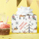 Um veado e um pequeno pássaro de ouro trabalham juntos para prender luzes de Férias em uma árvore quase nua neste belo papel de embrulho de Natal. Uma velha coruja sábia no vestido de inverno olha para você, e alguns flocos de neve descem pela cena. O texto do costume vermelho diz "Feliz Natal". Único!