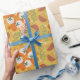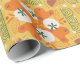 A vibrant wrapping paper with an orange and yellow floral pattern, featuring white and blue flowers. The design is shown unrolled and flat.