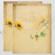 Um efeito de papel antigo, com texto e logotipo vintage, acentuado por girassóis brilhantes. Esses papéis são ideais para adicionar aos seus álbuns de recortes, colagens e diários junk de tema vintage e rústico.