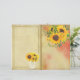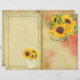 Papel em estilo de diário de página dupla em tons terrosos com um toque de vermelho e girassóis brilhantes. A parte de trás deste papel tem um design envelhecido correspondente com linhas.