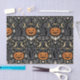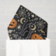 Um dramático padrão de Halloween inspirado no Art Déco, com repetição, colocado contra um fundo preto profundo, apresentando gatos pretos elegantes e estilizados com olhos verdes brilhantes dispostos em um ritmo ousado e simétrico. Motivos clássicos de Halloween — abóboras, luas crescentes, morcegos, aranhas, teias de aranha, chapéus de bruxa e estrelas geométricas cintilantes — são apresentados em formas refinadas do Déco com linhas limpas e contraste elegante. Uma paleta limitada de preto tinta, laranja-abóbora quente, dourado champanhe e marfim suave cria um clima glamoroso e noturno que parece luxuoso e sofisticado em vez de divertido.