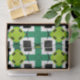 Padrão geométrico decorativo sem costura, com formas geométricas em verde, preto e branco.