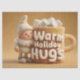 A charming and sweet 3D render or miniature photograph featuring an adorable, fluffy beige felt gnome standing next to a large, textured fabric mug. The gnome has a large white beard, pink cheeks, and a beige knitted hat. The oversized mug is labeled with the message "Warm Holiday Hugs" in white, marshmallow-like letters, and is overflowing with soft white marshmallows. The scene is set against a warm, soft ochre background, emphasizing the cozy, comforting, and whimsical nature of the image.
