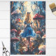 Uma design de dissociação cômica com Alice caminhando por um caminho de floresta revestido com cogumelos bonés vermelhos, capturando o charme mágico da Terra Maravilha.