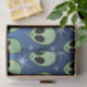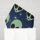 Um padrão de cabeça alienígena verde com olhos ovais grandes e pretos e um pequeno pedaço preto para a boca. O fundo é uma cor de gradiente azul-escuro a claro, pontilhado com estrelas brancas.