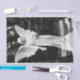 Belo anjo segurando flores com um leve sorriso e suas asas se espalham. Fotografia em preto e branco.