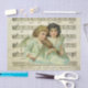 Vintage ilustra as férias de Natal com uma imagem religiosa de dois anjos; antiga vitoriana morta cortada sobre partituras. Um anjo está tocando um instrumento musical de cordas, o violino, e o outro anjo músico está segurando partituras. Deixe esta bela design angélica te ajudar a celebrar as férias desta temporada.