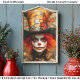 A fantastical figure sits amid autumn leaves, dressed in a richly detailed patchwork jacket with spiderweb textures. With red hair, painted skin, and a clown smile, this curious character deals a hand of cards. A tall, eccentric top hat crowns the look, adorned with whimsical patterns, and a perched butterfly—strongly evoking the Mad Hatter from Alice in Wonderland. The design is both theatrical and dreamlike. Artwork similar to a digitally painted storybook fantasy portrait with autumnal whimsy…..COLOR COMBINATIONS: Red, orange, yellow, brown, white, gray…..PERFECT FOR: