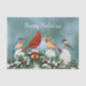 Uma coleção de passarinhos em uma cerca coberta de neve decorada com a terra de Natal. As espécies de aves incluem o pássaro azul oriental, cardeais vermelhos nortes e frango de pele negra. A cerca é enfeitada com uma garland de Natal feita de galhos de pínus, cones e bagas ocas, acentuadas com sinos dourados e uma fita vermelha brilhante.