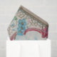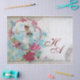 Elegante, sofisticado, vibrante e clássico design floral. Rosas vermelhas, rosadas, flores azuis com uma pomba branca carregando uma carta em uma paisagem marinha.
