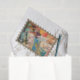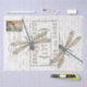 Colagem de dois insetos de libélula azul-lacrimogêneo num pano de fundo de guião francês e selos postais com marcas de cancelamento. Excelente para projetos de dissociação e transferências de mobiliário.