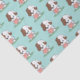 Adorável padrão repetido de um cão branco de desenho animado com manchas marrons no rosto, ouvidos e cauda. Ele está sentado na grama verde abraçando um coração de amor rosa em suas pequenas patas.