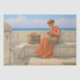 O artigo dos tecidos apresenta a pintura "Canções Sem Palavras" (1918) de John William Godward. Este trabalho de arte clássico, de cor clara, apresenta uma mulher segurando uma flauta em um banco ao lado de um pássaro enjaulado com um fundo oceânico. Principalmente tons de laranja, azul e marrom.