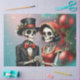 Christmas Bone Romance, A festive skeleton couple. This charming skeleton couple celebrates the festive spirit of Christmas. He wears an elegant black top hat decorated with holly sprigs and framed by a red ribbon. His black suit looks stylish and timeless, complemented by a bright red bow tie that adds a festive touch. She wears an elegant red bonnet with lace trim, also decorated with holly sprigs. In the background, lush Christmas tree branches decorated with red ornaments can be seen.