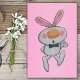 Estas folhas de papel são cor-de-rosa vibrante com um coelho de desenho animado dando um sinal de polegar para cima vestindo uma gravata arco preta, com bochechas rosadas e nariz laranja grande.
