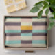 A colorful, geometric pattern with vertical stripes in teal, cream, peach, dark brown, and orange arranged in rows. The design conveys a retro, vibrant feel.