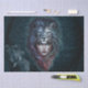 O coração e a força feminina de Leão, uma fusão majestosa. Este é um retrato impressionante de uma mulher cuja aparência é complementada por uma fusão contínua com a cabeça de um leão majestoso. A mulher tem pele justa e olhos verdes brilhantes, enquadrados por um delicado padrão branco, enfatizando sua expressividade. Seu cabelo é estirado a se misturar perfeitamente ao homem do leão — uma união fluente que cria a impressão de que eles são um. O homem de leão é pintado em tons de cinza azul, dando à imagem uma presença poderosa, enquanto os olhos piercing do leão transmitem um olhar intenso.