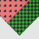 Folha de papel de tecido Whimsical apresenta padrão de melancia rosa e corações pretos com borda inferior verde-escura do tabuleiro de xadrez.