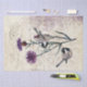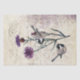 Dois frangos pretos investigam uma flor de solteiro de girassol roxo. Roteiro postale e francês no fundo em pergaminho com sotaques de tinta púrpura. Excelente para desacoplamento.