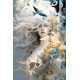 Uma bela senhora de cabelo branco fluindo que é macia e delicada, criando um sentido de pureza e elegância. Eles são exibidos de forma destacada, provavelmente simbolizando a leveza e a graça. Os tons de azul, fornecem uma canvas calma e tranquila que complementa as penas brancas. O azul pode representar a paz ou o céu, acrescentando profundidade à composição.