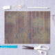 Design de papel de seda vintage com padrão damasco vermelho e dourado envelhecido em um fundo de madeira.