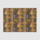 Um papel de tecidos de Natal muito fofo e festivo, com decorações de Natal douradas, incluindo árvores de Natal ouros, ouro holly com frutas vermelhas, arcos de seda dourada e bonitos bonecos vestidos em colete de veludo azul e chapéu de topo, espalhados sobre fundo de bronze/castanho, para adicionar um toque especial ao seu presente nesta época de férias.