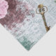 Flores de papoila, cor-de-rosa e roxa, chave de esqueleto de vintage, impressão de jornal com pintura burgundy e moldura ornamental vintage.