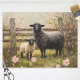 Tecido de dissociação cardíaco que apresenta trabalho de arte de ovelha e cordeiro num campo de primavera, cercado por flores florescentes, perfeito para adicionar um toque de elegância pastoral a artesanatos e embrulho de presentes.