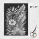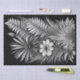 Uma ilustração intrincada e detalhada de flores e sementes tropicais arranjada em uma bela composição. O esquema de cores preto e branco acrescenta um sentido de elegância à ilustração. Esta ilustração é desenhada com fundo preto para permitir que as flores e as verduras se destacem.