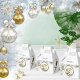 Condecorações de árvores Douradas e prateadas espumantes cercadas por folhagem festiva verde-salva com neve recém-caída numa terra maravilhosa de inverno.