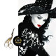 Essa imagem conta a história de uma figura enigmática e etérea, mesclando elementos de alta moda com um fascínio quase de outro mundo. O assunto é uma mulher vestida num impressionante conjunto preto adornada com padrões florais brancos, que cria um belo contraste e adiciona um toque de elegância inspirada na natureza à roupa. A paleta preta e branca é clássica e moderna, enfatizando a natureza eterno do design. Seu rosto pintou um branco de porcelana, com maquiagem meticulosamente trabalhada que acentua suas feições. Lábios vermelhos e negros se destacam contra sua pele pálida, chamando a atenção do espectador e acrescentando um talento dramático à composição. Suas sobrancelhas são moldadas em forma artística e não convencional, parecendo penas delicadas, o que reforça a mística geral de sua aparência. O chapéu grande que ela veste é igualmente cativante, com sua grande brim e intrincados padrões abstrato que ecoam os motivos florais em sua roupa. Este chapéu lança uma sutil sombra sobre o seu rosto, acrescentando ainda mais ao sentimento de mistério e sofisticação. O que torna esta imagem tão única é a combinação de elementos que evoca tanto a beleza clássica quanto a arte de vanguarda. Os padrões florais e o forte contraste de cores lembram a elegância vintage, enquanto a maquiagem e o design trazem ao retrato uma sensação contemporânea, quase futurista. Essa mistura de estilos cria uma narrativa visual intrigante e cativante, convidando os espectadores a explorar as profundezas de sua expressão artística.