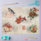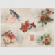 "Vintage Ephemera Bird Fall Flower Script Decoupage Tissue Paper, papel de tecido pesado para desacoplamento ou doação de presentes." Letras de caligrafia manuscritas com selos e carimbos são o fundo colorido de pergaminho mole para floral da safra em vermelhos quentes, ferrugem, castanho rosa e verde. Arte projetada graficamente pela artista e designer internacionalmente licenciada, Audrey Jeanne Roberts, copyright.