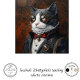 A imagem apresenta um gato macho desagradável vestido com uma roupa elaborada, ao estilo vitoriano, perfeita para o Dia de os namorados. O gato está vestindo uma camisa branca com colarinho alto, um colar preto, e uma jaqueta preta enfeitada com intrincado bordado de ouro e um grande broche de ornamentado. Ele também tem uma gravata vermelha de arco e um sino pendurado no pescoço, acrescentando um toque de charme e sofisticação. O fundo apresenta um padrão rico, escuro e ornamentado, que melhora a sensação luxuosa e histórica da cena. Esta imagem única e caprichosa combina elementos da moda histórica com o encanto felino, fazer que ele visualmente cativante e perfeito para projetos temáticos do Dia de os namorados. Gato de Namorados do coração, roupa de gato ao estilo vitoriano, gato macho cortante, bordado de ouro intrincado, gravata vermelha de arco, broche de ornamentado, imagem de gato branco, encanto felino, gato de moda histórico, gato Dia de os namorados.