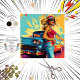Uma ilustração estilizada de uma pessoa ao lado de um carro clássico. A pessoa está vestindo um chapéu amplo, um topo vermelho e jeans de denim. O carro tem proeminentes alfaias e faróis redondos, indicativos do vintage design automóvel americano. O fundo apresenta abstrato de cores amarelas, azuis e vermelhas, acrescentando um toque vibrante e artístico à cena