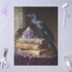 Um corvo preto brilhante com olhos vermelhos perche sobre uma pilha de livros meteorológicos, cercado por cristais ametistas espalhados em veludo roxo profundo.