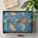 Padrão de silhueta colorida do dinossauro. Tyrannosaurus Rex, titanossauros, Tricerátopo, raptores, Ankylosaurs, Dino-Birds, Stegosaurus, Apatosaurus, Pteranodon e mais num padrão colorido em fundo azul, e dinossauros em verde, azul, amarelo e laranja.